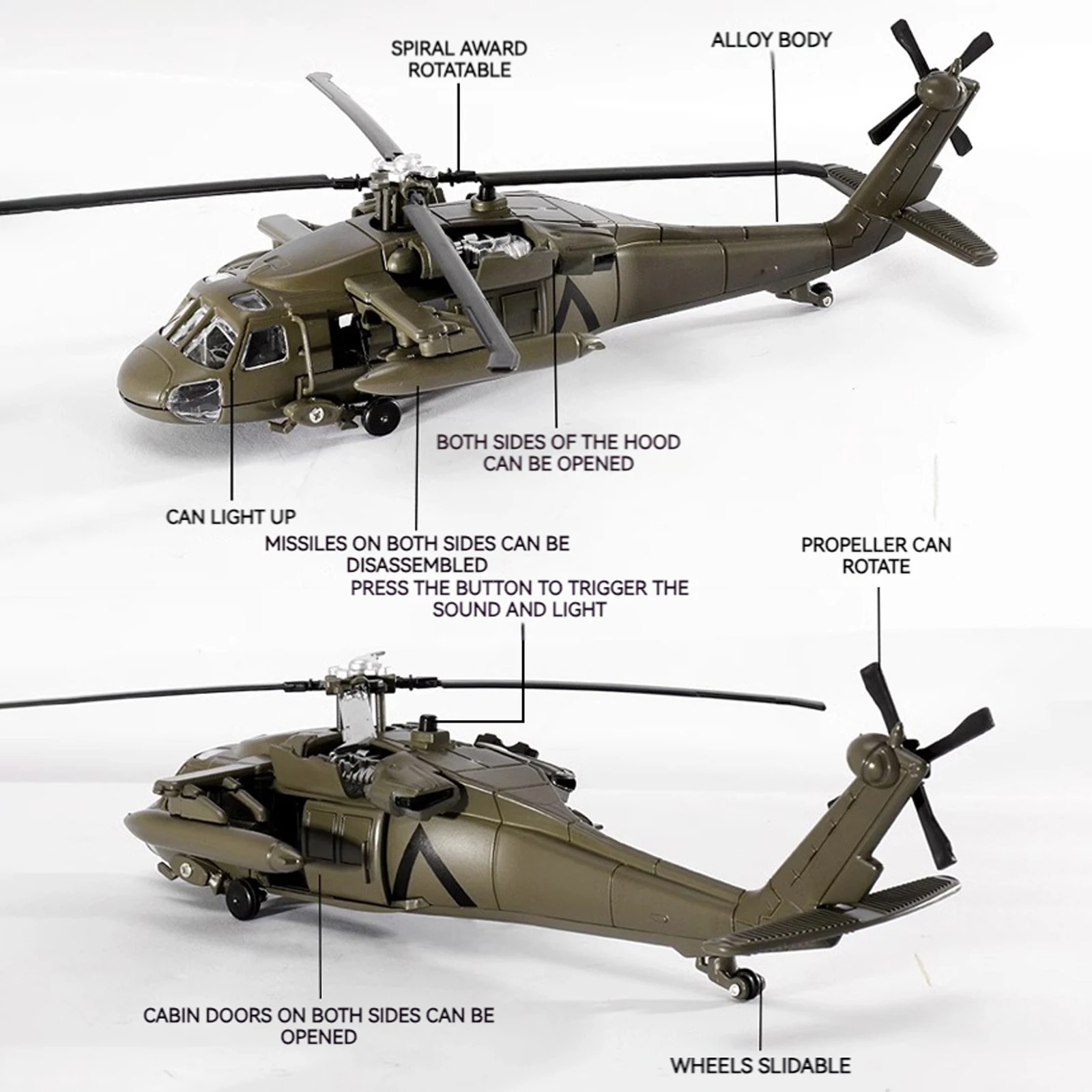 Detailed Black Hawk helicopter alloy model with display stand and gift box packaging, featuring realistic sound and light effects, perfect for collectors and display. 🚁✨