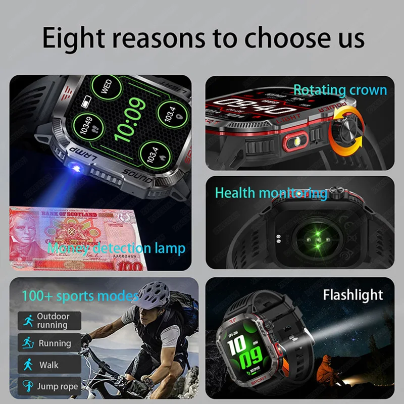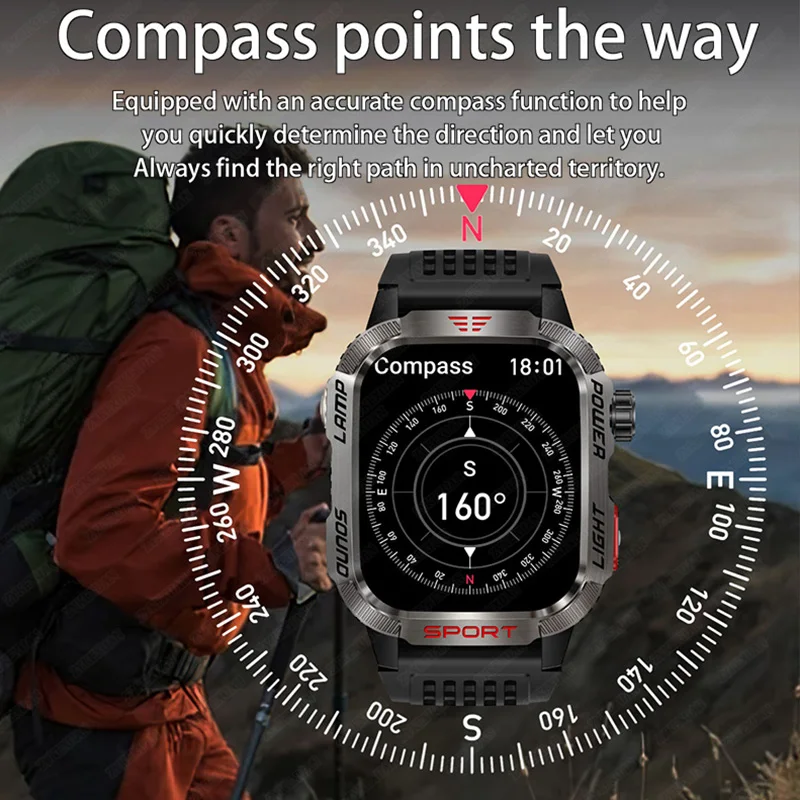 Rugged 2026 military-style GPS smartwatch with built-in flashlight, compass, and Bluetooth calling—perfect for outdoor adventures and everyday durability. Waterproof design with multi-sport tracking keeps you ready for anything. ⌚🌍